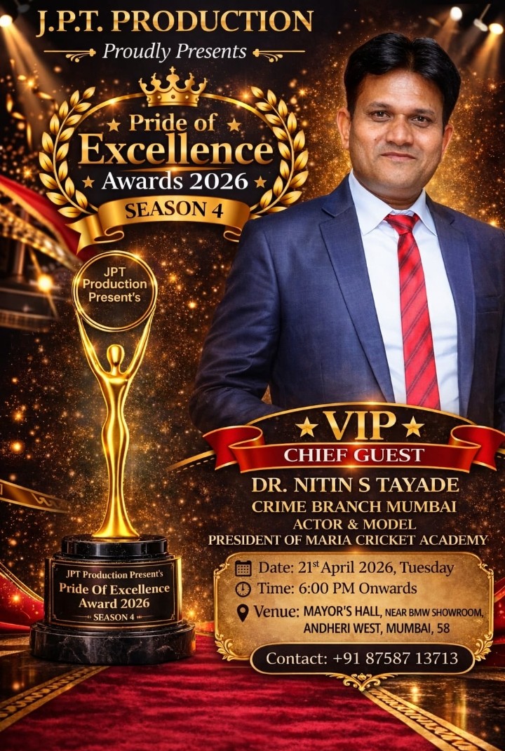 प्रथम दस्तक लेटेस्ट न्यूज **मुंबई क्राइम ब्रांच के बहादुर और जांबाज़ अधिकारी डॉ. नितिन एस. तयाडे होंगे “Pride of Excellence Awards 2026 – Season 4” के VIP Chief Guest** April 3, 2026 प्रथम10तक NEWS No Comments प्रथम 10तक न्यूज चैनल एवं पोर्टल समाचार अंधेरी पश्चिम मुंबई देशभर की प्रतिभाओं को सम्मानित करने के उद्देश्य से **JPT Production** द्वारा आयोजित प्रतिष्ठित अवॉर्ड समारोह **“Pride of Excellence Awards…
