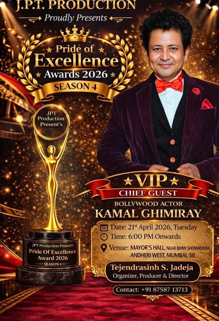 प्रथम दस्तक लेटेस्ट न्यूज **“तारक मेहता का उल्टा चश्मा” में अय्यर के बॉस का दमदार रोल निभाने वाले एक्टर कमल घीमीराय होंगे Pride of Excellence Awards 2026 – Season 4 के VIP Chief Guest** April 3, 2026 प्रथम10तक NEWS No Comments मुंबई: JPT Production द्वारा आयोजित होने जा रहा भव्य अवॉर्ड शो **“Pride of Excellence Awards 2026 – Season 4”** इस साल और भी ज्यादा खास होने वाला है, क्योंकि इस…