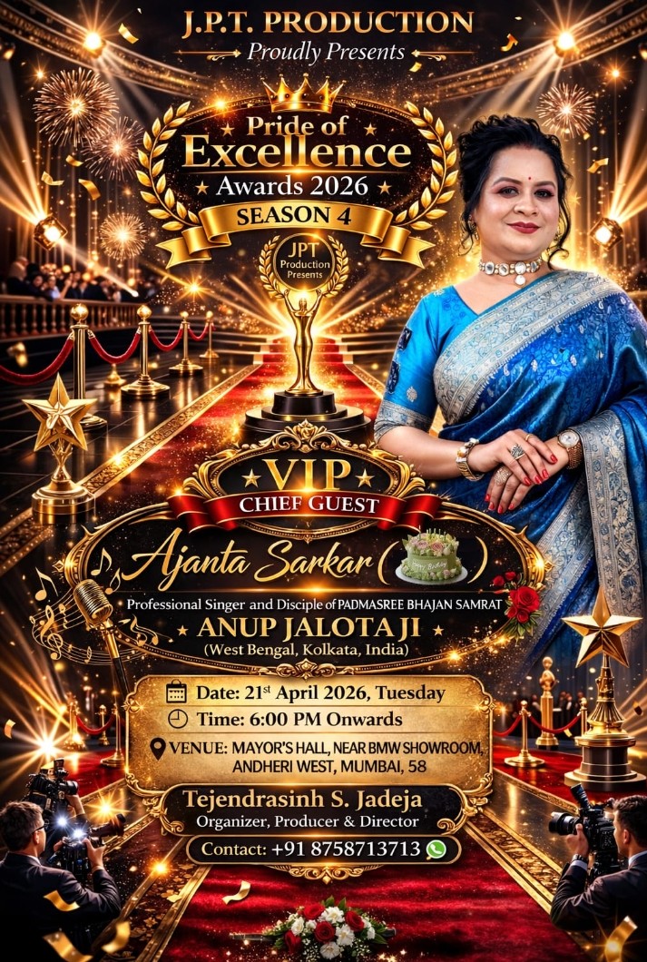 प्रथम दस्तक लेटेस्ट न्यूज **भजन सम्राट अनुप जलोटा जी की शिष्या और प्रसिद्ध सिंगर अजन्ता सरकार होंगी Pride of Excellence Awards 2026 – Season 4 की VIP Chief Guest** April 3, 2026 प्रथम10तक NEWS No Comments मुंबई: JPT Production द्वारा आयोजित होने जा रहा भव्य अवॉर्ड शो **“Pride of Excellence Awards 2026 – Season 4”** इस साल और भी ज्यादा खास बनने जा रहा है, क्योंकि…