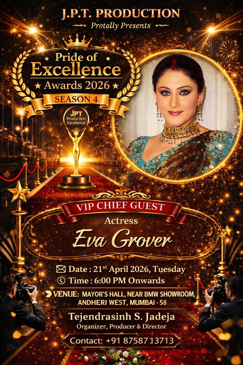 प्रथम दस्तक लेटेस्ट न्यूज 📰 **बॉलीवुड और टीवी इंडस्ट्री की जानी-मानी एक्ट्रेस ईवा ग्रोवर करेंगी “Pride of Excellence Awards 2026 – Season 4” में शिरकत, बनेंगी VIP Chief Guest** April 6, 2026 प्रथम10तक NEWS No Comments प्रथम 10तक न्यूज चैनल एवं पोर्टल मनोज वर्मा (स्वतंत्र) प्रधान संपादक 8689975743 JPT Production द्वारा आयोजित होने जा रहा प्रतिष्ठित और भव्य अवॉर्ड समारोह **“Pride of Excellence Awards 2026 –…