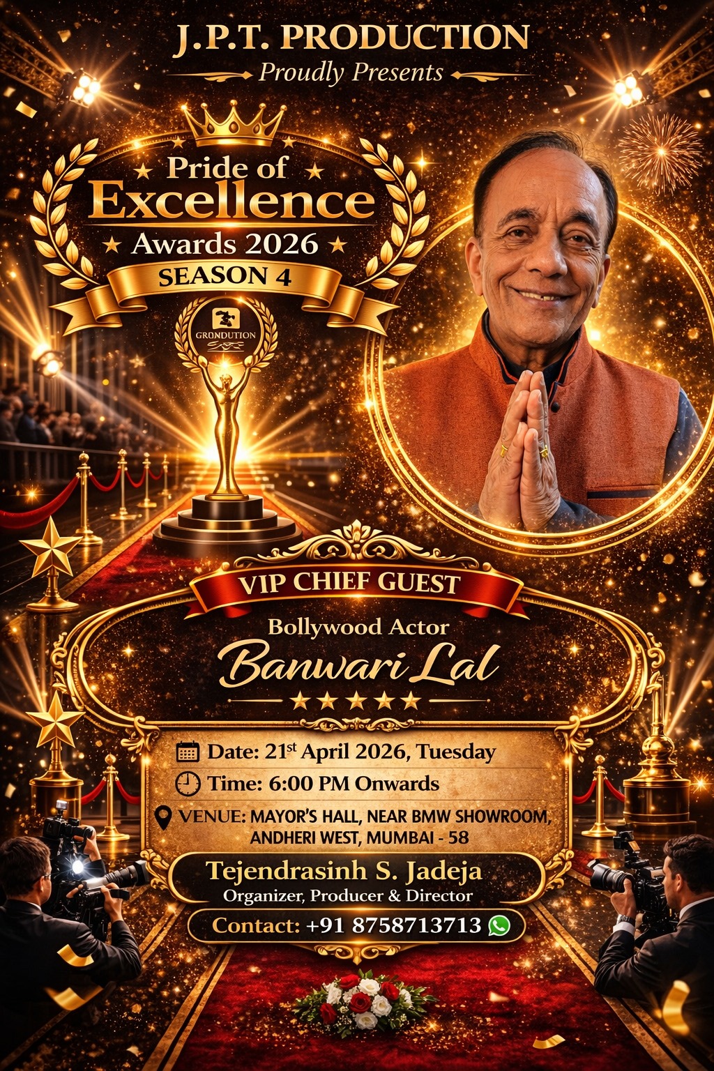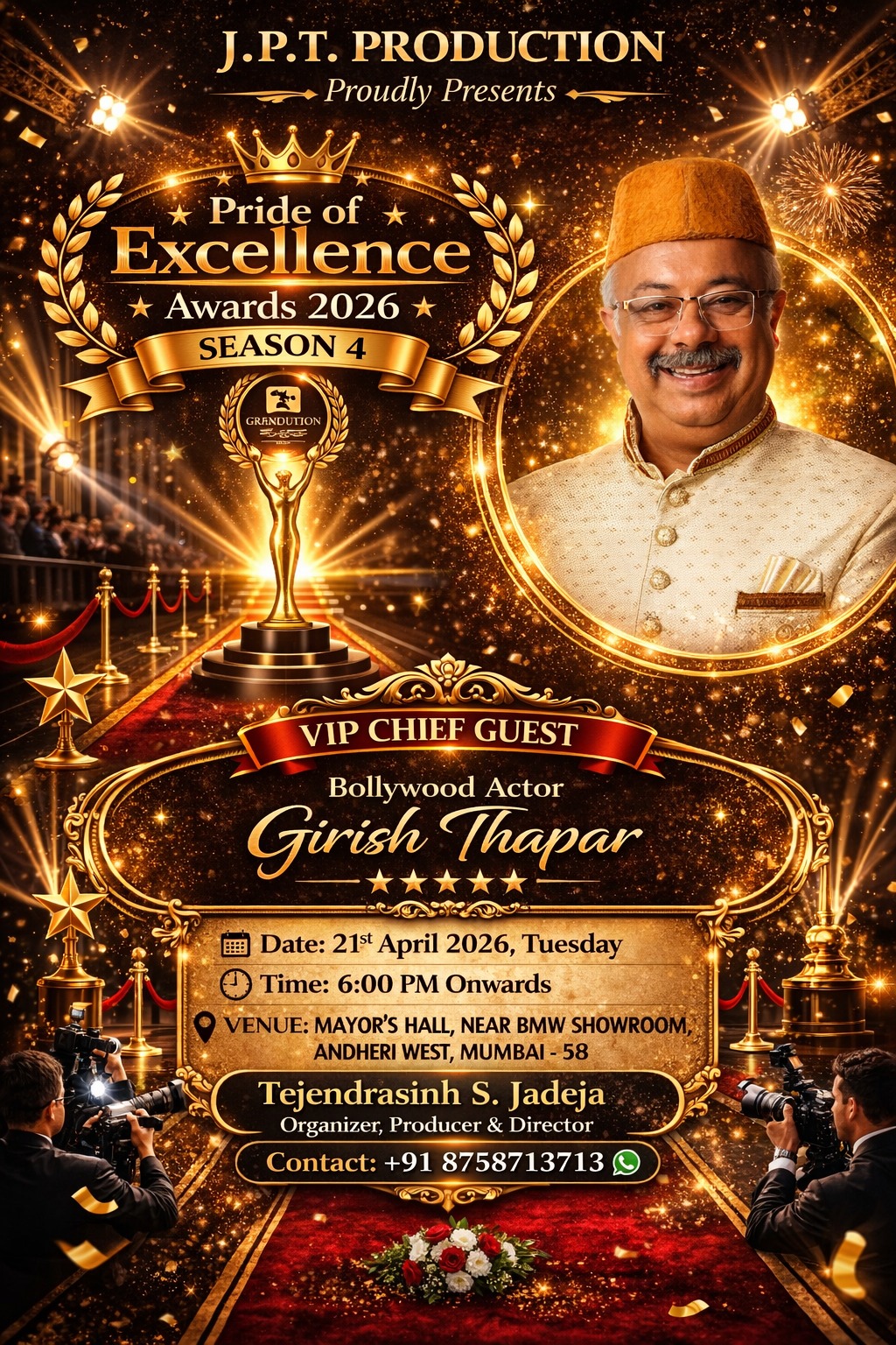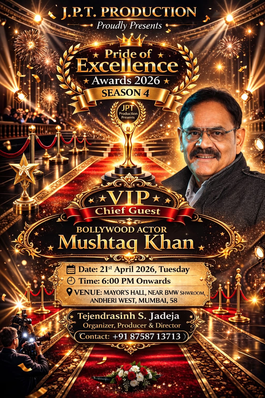 प्रथम दस्तक लेटेस्ट न्यूज 📰 **गुजराती सिनेमा के दिग्गज एक्टर-डायरेक्टर-प्रोड्यूसर राजदीप होंगे “Pride of Excellence Awards 2026 – Season 4” के VIP Chief Guest** April 6, 2026 प्रथम10तक NEWS No Comments प्रथम 10तक न्यूज चैनल एवं पोर्टल मनोज वर्मा (स्वतंत्र) प्रधान संपादक 8689975743 मुंबई: JPT Production द्वारा आयोजित होने जा रहा प्रतिष्ठित और भव्य अवॉर्ड समारोह **“Pride of Excellence Awards 2026…