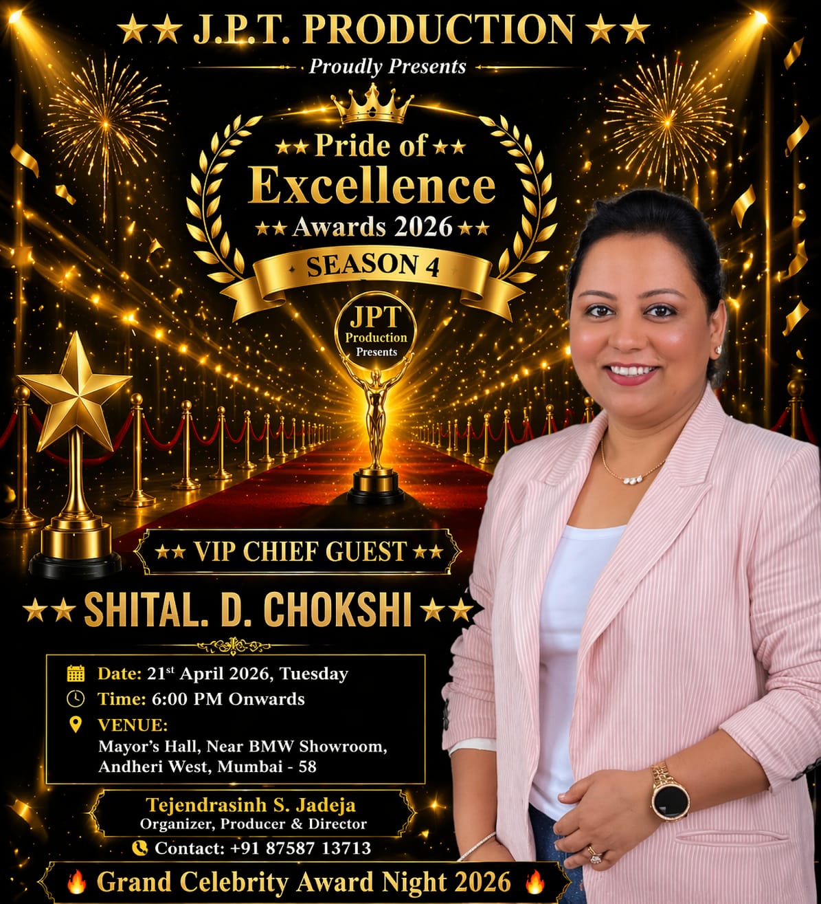 प्रथम दस्तक लेटेस्ट न्यूज 📰 **[VIP CHIEF GUEST SHITAL.D. CHOKSHI] की भव्य मौजूदगी से सजेगा “Pride of Excellence Awards 2026 – Season 4”, बढ़ेगी कार्यक्रम की शान** April 10, 2026 प्रथम10तक NEWS No Comments प्रथम 10तक न्यूज चैनल एवं पोर्टल समाचार अंधेरी पश्चिम मुंबई 93093754289 मुंबई: JPT Production द्वारा आयोजित होने जा रहा प्रतिष्ठित और भव्य अवॉर्ड समारोह **“Pride of Excellence Awards 2026 –…