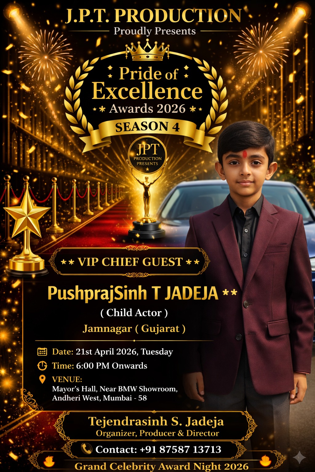 प्रथम दस्तक लेटेस्ट न्यूज 📰 **[VIP CHIEF GUEST Pushpraj Sinh T. Jadeja] की भव्य मौजूदगी से सजेगा “Pride of Excellence Awards 2026 – Season 4”, बढ़ेगी कार्यक्रम की शान** April 10, 2026 प्रथम10तक NEWS No Comments प्रथम 10तक न्यूज चैनल एवं पोर्टल समाचार अंधेरी पश्चिम मुंबई 9303754289 : JPT Production द्वारा आयोजित होने जा रहा प्रतिष्ठित और भव्य अवॉर्ड समारोह **“Pride of Excellence Awards 2026 –…