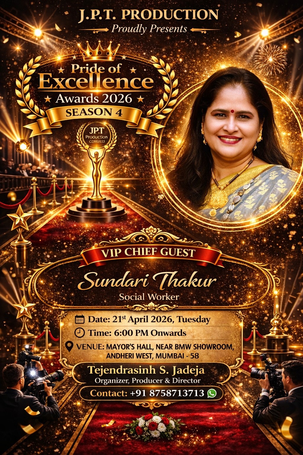 प्रथम दस्तक लेटेस्ट न्यूज 📰 **[VIP CHIEF GUEST Sundari Thakur] की भव्य मौजूदगी से सजेगा “Pride of Excellence Awards 2026 – Season 4”, बढ़ेगी कार्यक्रम की शान** April 14, 2026 प्रथम10तक NEWS No Comments मुंबई: JPT Production द्वारा आयोजित होने जा रहा प्रतिष्ठित और भव्य अवॉर्ड समारोह **“Pride of Excellence Awards 2026 – Season 4”** इस साल और भी ज्यादा खास और यादगार बनने…