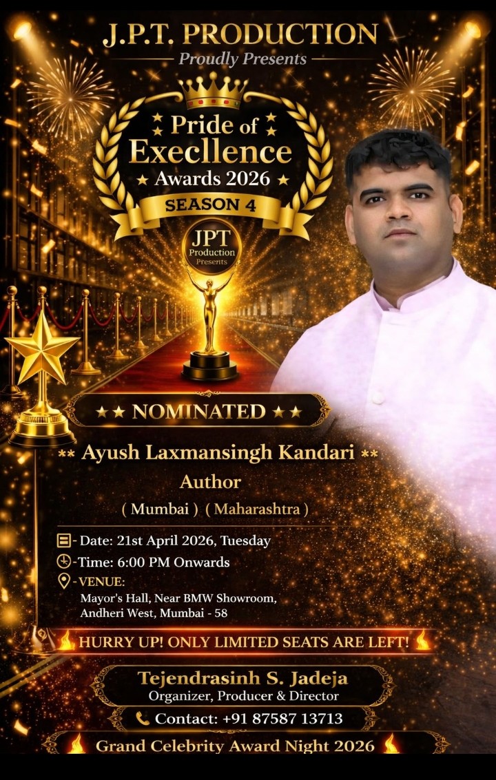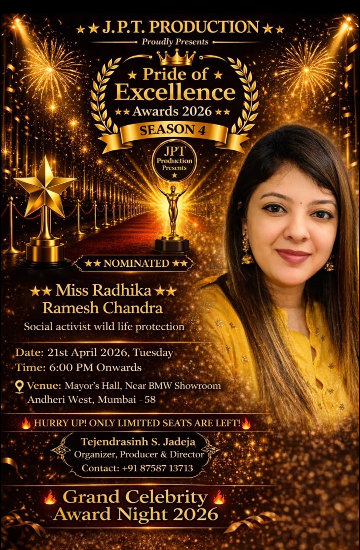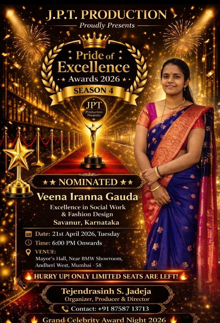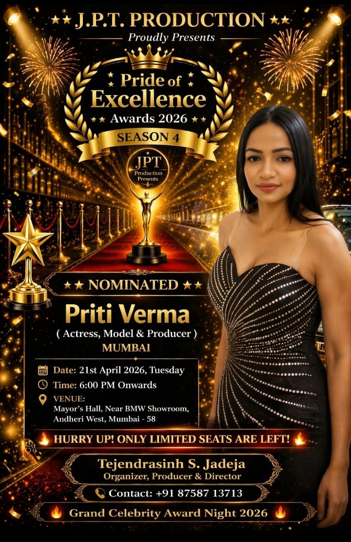 📰 **[AWARDEE NAME] को मिलेगा “Pride of Excellence Awards 2026 – Season 4” में सम्मान, उपलब्धियों का होगा गौरवपूर्ण सम्मान** मुंबई: JPT Production द्वारा आयोजित होने जा रहा प्रतिष्ठित अवॉर्ड समारोह **“Pride of Excellence Awards 2026 – Season 4”** इस साल एक बार फिर टैलेंट और मेहनत को सम्मानित करने के लिए तैयार है। इस खास मंच पर **[AWARDEE NAME]** को उनके उत्कृष्ट कार्य और उपलब्धियों के लिए सम्मानित किया जाएगा। **[AWARDEE NAME]** ने अपने क्षेत्र में कड़ी मेहनत, समर्पण और लगन से एक अलग पहचान बनाई है। उनके कार्यों ने समाज और इंडस्ट्री दोनों में सकारात्मक प्रभाव डाला है, जिसके चलते उन्हें इस प्रतिष्ठित मंच पर सम्मानित किया जा रहा है। यह सम्मान उनके करियर के लिए एक महत्वपूर्ण उपलब्धि साबित होगा और आने वाले समय में उन्हें और भी प्रेरणा देगा। यह भव्य आयोजन **JPT Production** के Founder, Organizer, Producer & Director **तेजेन्द्रसिंह एस. जाडेजा (तेजुभा जाडेजा)** द्वारा किया जा रहा है। खास बात यह है कि यह कार्यक्रम उनके पुत्र **पुष्पराजसिंह तेजुभा जाडेजा** के जन्मदिन के शुभ अवसर पर आयोजित किया जा रहा है, जिससे यह समारोह और भी विशेष बन जाता है। 📍 **Event Details** Pride of Excellence Awards 2026 – Season 4 📅 Date: 21 April 2026 (Tuesday) 🕕 Time: 6:00 PM Onwards 📍 Venue: Mayor’s Hall, Near BMW Showroom, Andheri West, Mumbai – 58 🎬 Organizer, Producer & Director Tejendrasinh S. Jadeja 📞 Contact: +91 87587 13713 ✨ यह सम्मान उनके शानदार सफर को एक नई पहचान देगा।