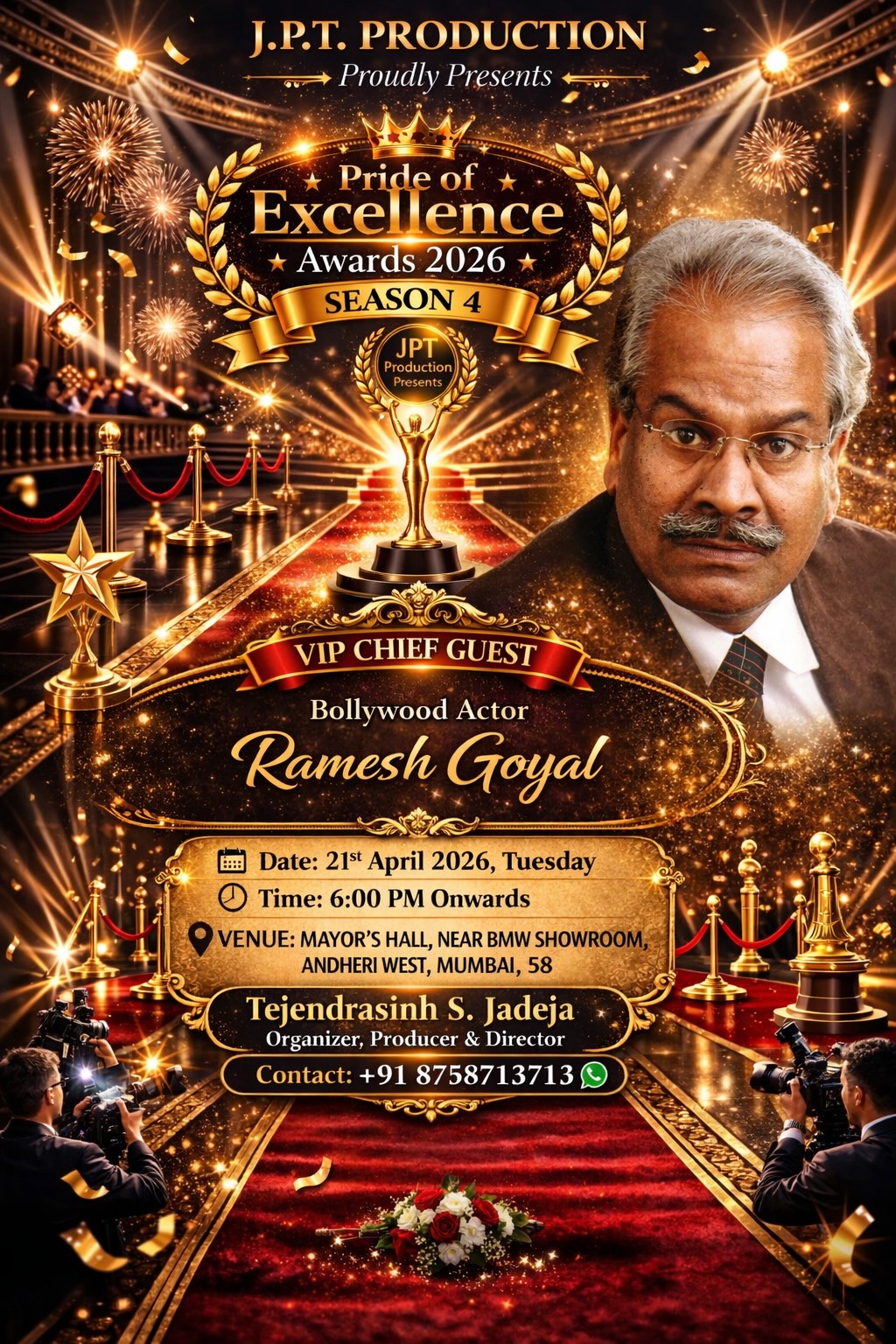 рдкреНрд░рдердо 10рддрдХ рдиреНрдпреВрдЬ рдЪреИрдирд▓ рдПрд╡рдВ рдкреЛрд░реНрдЯрд▓ рдордиреЛрдЬ рд╡рд░реНрдорд╛ (рд╕реНрд╡рддрдВрддреНрд░)рдкреНрд░рдзрд╛рди рд╕рдВрдкрд╛рджрдХ 8689975743 рдореБрдВрдмрдИ: JPT Production рджреНрд╡рд╛рд░рд╛ рдЖрдпреЛрдЬрд┐рдд рд╣реЛрдиреЗ рдЬрд╛ рд░рд╣рд╛ рднрд╡реНрдп рдФрд░ рдкреНрд░рддрд┐рд╖реНрдард┐рдд рдЕрд╡реЙрд░реНрдб рд╕рдорд╛рд░реЛрд╣ **тАЬPride of Excellence Awards 2026 тАУ Season 4тАЭ** рдЗрд╕ рд╕рд╛рд▓ рдПрдХ рдмрд╛рд░ рдлрд┐рд░ рдЧреНрд▓реИрдорд░, рд╕рдореНрдорд╛рди рдФрд░ рд╢рд╛рдирджрд╛рд░ рдЖрдпреЛрдЬрди рдХрд╛ рдкреНрд░рддреАрдХ рдмрдирдиреЗ рдЬрд╛ рд░рд╣рд╛ рд╣реИред рдЗрд╕ рдЦрд╛рд╕ рдЕрд╡рд╕рд░ рдкрд░ рдмреЙрд▓реАрд╡реБрдб рдХреЗ рд╡рд░рд┐рд╖реНрда рдФрд░ рд╕рдореНрдорд╛рдирд┐рдд рдЕрднрд┐рдиреЗрддрд╛ **рд░рдореЗрд╢ рдЧреЛрдпрд▓** VIP Chief Guest рдХреЗ рд░реВрдк рдореЗрдВ рдЕрдкрдиреА рдЧрд░рд┐рдорд╛рдордпреА рдЙрдкрд╕реНрдерд┐рддрд┐ рджрд░реНрдЬ рдХрд░рд╛рдПрдВрдЧреЗред рд░рдореЗрд╢ рдЧреЛрдпрд▓ рдиреЗ рдЕрдкрдиреЗ рд▓рдВрдмреЗ рдФрд░ рд╕рдлрд▓ рдЕрднрд┐рдирдп рдХрд░рд┐рдпрд░ рдореЗрдВ рдХрдИ рдлрд┐рд▓реНрдореЛрдВ рдФрд░ рдкреНрд░реЛрдЬреЗрдХреНрдЯреНрд╕ рдореЗрдВ рдмреЗрд╣рддрд░реАрди рдкреНрд░рджрд░реНрд╢рди рдХрд┐рдпрд╛ рд╣реИред рдЙрдирдХреА рд╕рд╛рджрдЧреА, рдЕрдиреБрднрд╡ рдФрд░ рджрдорджрд╛рд░ рдЕрднрд┐рдирдп рдиреЗ рдЙрдиреНрд╣реЗрдВ рдЗрдВрдбрд╕реНрдЯреНрд░реА рдореЗрдВ рдПрдХ рдЦрд╛рд╕ рдФрд░ рд╕рдореНрдорд╛рдирдЬрдирдХ рд╕реНрдерд╛рди рджрд┐рд▓рд╛рдпрд╛ рд╣реИред рд╡реЗ рдЕрдкрдиреЗ рд╢рд╛рдирджрд╛рд░ рд╡реНрдпрдХреНрддрд┐рддреНрд╡ рдФрд░ рдЕрдиреБрднрд╡реА рдЕрднрд┐рдирдп рдХреЗ рд▓рд┐рдП рдЬрд╛рдиреЗ рдЬрд╛рддреЗ рд╣реИрдВ, рдЬрд┐рд╕рд╕реЗ рд╡реЗ рдЖрдЬ рднреА рджрд░реНрд╢рдХреЛрдВ рдХреЗ рдмреАрдЪ рдХрд╛рдлреА рд▓реЛрдХрдкреНрд░рд┐рдп рд╣реИрдВред рдЙрдирдХреА рдЧрд░рд┐рдорд╛рдордпреА рдЙрдкрд╕реНрдерд┐рддрд┐ рдЗрд╕ рдЕрд╡реЙрд░реНрдб рд╕рдорд╛рд░реЛрд╣ рдХреЛ рдФрд░ рднреА рдкреНрд░рддрд┐рд╖реНрдард┐рдд рдФрд░ рдЦрд╛рд╕ рдмрдирд╛рдПрдЧреАред рдРрд╕реЗ рдЕрдиреБрднрд╡реА рдХрд▓рд╛рдХрд╛рд░ рдХрд╛ рдЗрд╕ рдордВрдЪ рд╕реЗ рдЬреБрдбрд╝рдирд╛ рдЗрд╕ рдХрд╛рд░реНрдпрдХреНрд░рдо рдХреА рдЧрд░рд┐рдорд╛ рдХреЛ рдФрд░ рдКрдВрдЪрд╛рдИ рджреЗрдЧрд╛ред рдпрд╣ рднрд╡реНрдп рдЖрдпреЛрдЬрди **JPT Production** рдХреЗ Founder, Organizer, Producer & Director **рддреЗрдЬреЗрдиреНрджреНрд░рд╕рд┐рдВрд╣ рдПрд╕. рдЬрд╛рдбреЗрдЬрд╛ (рддреЗрдЬреБрднрд╛ рдЬрд╛рдбреЗрдЬрд╛)** рджреНрд╡рд╛рд░рд╛ рдЖрдпреЛрдЬрд┐рдд рдХрд┐рдпрд╛ рдЬрд╛ рд░рд╣рд╛ рд╣реИред рдЧреМрд░рддрд▓рдм рд╣реИ рдХрд┐ **Pride of Excellence Awards** рдХреЗ рдкрд┐рдЫрд▓реЗ рддреАрдиреЛрдВ рд╕реАрдЬрд╝рди рдмреЗрд╣рдж рд╕рдлрд▓ рдФрд░ рдпрд╛рджрдЧрд╛рд░ рд░рд╣реЗ рд╣реИрдВ рдФрд░ рдЕрдм **Season 4** рдХреЛ рдкрд╣рд▓реЗ рд╕реЗ рднреА рдЬреНрдпрд╛рджрд╛ рднрд╡реНрдп рдФрд░ рдРрддрд┐рд╣рд╛рд╕рд┐рдХ рдмрдирд╛рдиреЗ рдХреА рддреИрдпрд╛рд░рд┐рдпрд╛рдБ рдЬреЛрд░-рд╢реЛрд░ рд╕реЗ рдЪрд▓ рд░рд╣реА рд╣реИрдВред рдЗрд╕ рдЕрд╡реЙрд░реНрдб рд╢реЛ рдХрд╛ рдЙрджреНрджреЗрд╢реНрдп рджреЗрд╢рднрд░ рдХреЗ рдЯреИрд▓реЗрдВрдЯреЗрдб рд▓реЛрдЧреЛрдВ рдХреЛ рдПрдХ рдмрдбрд╝рд╛ рдордВрдЪ рджреЗрдирд╛ рдФрд░ рдЙрдиреНрд╣реЗрдВ рд