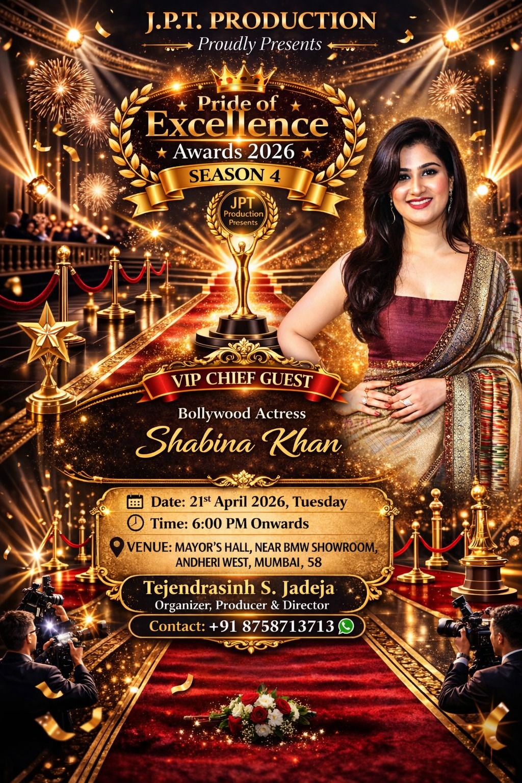 рдкреНрд░рдердо 10рддрдХ рдиреНрдпреВрдЬ рдЪреИрдирд▓ рдПрд╡рдВ рдкреЛрд░реНрдЯрд▓ рдордиреЛрдЬ рд╡рд░реНрдорд╛ (рд╕реНрд╡рддрдВрддреНрд░) рдкреНрд░рдзрд╛рди рд╕рдВрдкрд╛рджрдХ 8689975743 рдореБрдВрдмрдИ: JPT Production рджреНрд╡рд╛рд░рд╛ рдЖрдпреЛрдЬрд┐рдд рд╣реЛрдиреЗ рдЬрд╛ рд░рд╣рд╛ рдкреНрд░рддрд┐рд╖реНрдард┐рдд рдФрд░ рднрд╡реНрдп рдЕрд╡реЙрд░реНрдб рд╕рдорд╛рд░реЛрд╣ **тАЬPride of Excellence Awards 2026 тАУ Season 4тАЭ** рдЗрд╕ рд╕рд╛рд▓ рдЧреНрд▓реИрдорд░, рдЯреИрд▓реЗрдВрдЯ рдФрд░ рдЧреНрд░реИрдВрдб рд╕реЗрд▓рд┐рдмреНрд░реЗрд╢рди рдХрд╛ рдмреЗрд╣рддрд░реАрди рд╕рдВрдЧрдо рдмрдирдиреЗ рдЬрд╛ рд░рд╣рд╛ рд╣реИред рдЗрд╕ рд╢рд╛рдирджрд╛рд░ рдЗрд╡реЗрдВрдЯ рдореЗрдВ рдЕрдм рдмреЙрд▓реАрд╡реБрдб рдХреА рдЬрд╛рдиреА-рдорд╛рдиреА рдПрдХреНрдЯреНрд░реЗрд╕ рдФрд░ рдкреНрд░реЛрдбреНрдпреВрд╕рд░ **рд╢рдмреАрдирд╛ рдЦрд╛рди** VIP Chief Guest рдХреЗ рд░реВрдк рдореЗрдВ рдЕрдкрдиреА рдЦрд╛рд╕ рдЙрдкрд╕реНрдерд┐рддрд┐ рджрд░реНрдЬ рдХрд░рд╛рдПрдВрдЧреАред рд╢рдмреАрдирд╛ рдЦрд╛рди рдиреЗ рдмреЙрд▓реАрд╡реБрдб рдЗрдВрдбрд╕реНрдЯреНрд░реА рдореЗрдВ рдЕрдкрдиреЗ рдЯреИрд▓реЗрдВрдЯ, рдореЗрд╣рдирдд рдФрд░ рд╢рд╛рдирджрд╛рд░ рдХрд╛рдо рдХреЗ рджрдо рдкрд░ рдПрдХ рдЦрд╛рд╕ рдкрд╣рдЪрд╛рди рдмрдирд╛рдИ рд╣реИред рдПрдХ рд╕рдлрд▓ рдПрдХреНрдЯреНрд░реЗрд╕ рд╣реЛрдиреЗ рдХреЗ рд╕рд╛рде-рд╕рд╛рде рдЙрдиреНрд╣реЛрдВрдиреЗ рдкреНрд░реЛрдбреНрдпреВрд╕рд░ рдХреЗ рд░реВрдк рдореЗрдВ рднреА рдХрдИ рдкреНрд░реЛрдЬреЗрдХреНрдЯреНрд╕ рдореЗрдВ рдмреЗрд╣рддрд░реАрди рдпреЛрдЧрджрд╛рди рджрд┐рдпрд╛ рд╣реИред рдЙрдирдХреА рдкреНрд░реЛрдлреЗрд╢рдирд▓рд┐рдЬрд╝реНрдо, рдХреНрд░рд┐рдПрдЯрд┐рд╡ рд╡рд┐рдЬрд╝рди рдФрд░ рдЗрдВрдбрд╕реНрдЯреНрд░реА рдореЗрдВ рдордЬрдмреВрдд рдкрдХрдбрд╝ рдЙрдиреНрд╣реЗрдВ рдПрдХ рдЦрд╛рд╕ рдореБрдХрд╛рдо рдкрд░ рд▓реЗ рдЬрд╛рддреА рд╣реИред JPT Production рдХрд╛ рдпрд╣ рднрд╡реНрдп рдЕрд╡реЙрд░реНрдб рд╢реЛ рджреЗрд╢рднрд░ рдХреЗ рдЙрднрд░рддреЗ рд╣реБрдП рдФрд░ рд╕реНрдерд╛рдкрд┐рдд рдЯреИрд▓реЗрдВрдЯ рдХреЛ рдПрдХ рдмрдбрд╝рд╛ рдордВрдЪ рджреЗрдиреЗ рдХреЗ рд▓рд┐рдП рдЬрд╛рдирд╛ рдЬрд╛рддрд╛ рд╣реИред рдЦрд╛рд╕ рдмрд╛рдд рдпрд╣ рд╣реИ рдХрд┐ рдЗрд╕ рдЕрд╡реЙрд░реНрдб рд╢реЛ рдХреЗ рдкрд┐рдЫрд▓реЗ рддреАрдиреЛрдВ рд╕реАрдЬрд╝рди рдмреЗрд╣рдж рд╕рдлрд▓ рд░рд╣реЗ рд╣реИрдВ рдФрд░ рдЕрдм **Season 4** рдХреЛ рдкрд╣рд▓реЗ рд╕реЗ рднреА рдЬреНрдпрд╛рджрд╛ рднрд╡реНрдп рдФрд░ рдРрддрд┐рд╣рд╛рд╕рд┐рдХ рдмрдирд╛рдиреЗ рдХреА рддреИрдпрд╛рд░рд┐рдпрд╛рдБ рдЬреЛрд░-рд╢реЛрд░ рд╕реЗ рдЪрд▓ рд░рд╣реА рд╣реИрдВред рдЗрд╕ рдкреВрд░реЗ рднрд╡реНрдп рдЖрдпреЛрдЬрди рдХреЗ рдкреАрдЫреЗ рд╣реИрдВ **Organizer, Producer & Director рддреЗрдЬреЗрдиреНрджреНрд░рд╕рд┐рдВрд╣ рдПрд╕. рдЬрд╛рдбреЗрдЬрд╛ (рддреЗрдЬреБрднрд╛ рдЬрд╛рдбреЗрдЬрд╛)**, рдЬрд┐рдирдХреА рдореЗрд╣рдирдд рдФрд░ рд╡рд┐рдЬрд╝рди рдиреЗ рдЗрд╕ рдкреНрд▓реЗрдЯрдлреЙрд░реНрдо рдХреЛ рдПрдХ рдирдИ рдКрдВрдЪрд╛рдИ рдкрд░ рдкрд╣реБрдВрдЪрд╛рдпрд╛ рд╣реИред рд╢рдмреАрдирд╛ рдЦрд╛рди рдХреА рдореМрдЬреВрджрдЧреА рдЗрд╕ рдЗрд╡реЗрдВрдЯ рдХреЛ рдФрд░ рднреА рдЧреНрд▓реИрдорд░рд╕ рдФрд░ рдЦрд╛рд╕ рдмрдирд╛рдиреЗ рд╡рд╛рд▓реА рд╣реИред ЁЯУН **Event Details** Pride of Excellence Awards 2026 тАУ Season 4
