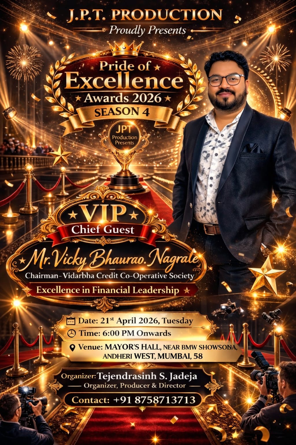 рдкреНрд░рдердо 10рддрдХ рдиреНрдпреВрдЬ рдЪреИрдирд▓ рдПрд╡рдВ рдкреЛрд░реНрдЯрд▓ рдордиреЛрдЬ рд╡рд░реНрдорд╛ рд╕реНрд╡рддрдВрддреНрд░ рдкреНрд░рдзрд╛рди рд╕рдВрдкрд╛рджрдХ 9303754289 рдореБрдВрдмрдИ: JPT Production рджреНрд╡рд╛рд░рд╛ рдЖрдпреЛрдЬрд┐рдд рд╣реЛрдиреЗ рдЬрд╛ рд░рд╣рд╛ рдкреНрд░рддрд┐рд╖реНрдард┐рдд рдФрд░ рднрд╡реНрдп рдЕрд╡реЙрд░реНрдб рд╕рдорд╛рд░реЛрд╣ **тАЬPride of Excellence Awards 2026 тАУ Season 4тАЭ** рдЗрд╕ рд╕рд╛рд▓ рдФрд░ рднреА рдЬреНрдпрд╛рджрд╛ рдЦрд╛рд╕ рдФрд░ рдпрд╛рджрдЧрд╛рд░ рдмрдирдиреЗ рдЬрд╛ рд░рд╣рд╛ рд╣реИред рдЗрд╕ рдЧреНрд░реИрдВрдб рдЗрд╡реЗрдВрдЯ рдореЗрдВ **[VIP CHIEF GUEST Me.Vicky Bhaurao Nagrale]** VIP Chief Guest рдХреЗ рд░реВрдк рдореЗрдВ рдЕрдкрдиреА рдЧрд░рд┐рдорд╛рдордпреА рдЙрдкрд╕реНрдерд┐рддрд┐ рджрд░реНрдЬ рдХрд░рд╛рдПрдВрдЧреЗред **[VIP CHIEF GUEST Mr.Vicky Bhaurao Nagrale]** рдЕрдкрдиреЗ рдХреНрд╖реЗрддреНрд░ рдореЗрдВ рдЙрддреНрдХреГрд╖реНрдЯ рдХрд╛рд░реНрдп, рдЕрдиреБрднрд╡ рдФрд░ рдкреНрд░рднрд╛рд╡рд╢рд╛рд▓реА рд╡реНрдпрдХреНрддрд┐рддреНрд╡ рдХреЗ рд▓рд┐рдП рдЬрд╛рдиреЗ рдЬрд╛рддреЗ рд╣реИрдВред рдЙрдирдХреА рдореМрдЬреВрджрдЧреА рдЗрд╕ рдЕрд╡реЙрд░реНрдб рд╕рдорд╛рд░реЛрд╣ рдХреЛ рдФрд░ рднреА рдкреНрд░рддрд┐рд╖реНрдард┐рдд рдФрд░ рднрд╡реНрдп рдмрдирд╛рдПрдЧреАред рдЙрдирдХрд╛ рдЗрд╕ рдордВрдЪ рд╕реЗ рдЬреБрдбрд╝рдирд╛ рди рд╕рд┐рд░реНрдл рдХрд╛рд░реНрдпрдХреНрд░рдо рдХреА рд╢реЛрднрд╛ рдмрдврд╝рд╛рдПрдЧрд╛, рдмрд▓реНрдХрд┐ рд╕рднреА рдкреНрд░рддрд┐рднрд╛рдЧрд┐рдпреЛрдВ рдФрд░ рдЕрд╡реЙрд░реНрдбреАреЫ рдХреЗ рд▓рд┐рдП рдкреНрд░реЗрд░рдгрд╛ рдХрд╛ рд╕реНрд░реЛрдд рднреА рдмрдиреЗрдЧрд╛ред рдпрд╣ рднрд╡реНрдп рдЖрдпреЛрдЬрди **JPT Production** рдХреЗ Founder, Organizer, Producer & Director **рддреЗрдЬреЗрдиреНрджреНрд░рд╕рд┐рдВрд╣ рдПрд╕. рдЬрд╛рдбреЗрдЬрд╛ (рддреЗрдЬреБрднрд╛ рдЬрд╛рдбреЗрдЬрд╛)** рджреНрд╡рд╛рд░рд╛ рдЖрдпреЛрдЬрд┐рдд рдХрд┐рдпрд╛ рдЬрд╛ рд░рд╣рд╛ рд╣реИред рдпрд╣ рдЦрд╛рд╕ рдЖрдпреЛрдЬрди рдЙрдирдХреЗ рдкреБрддреНрд░ **рдкреБрд╖реНрдкрд░рд╛рдЬрд╕рд┐рдВрд╣ рддреЗрдЬреБрднрд╛ рдЬрд╛рдбреЗрдЬрд╛** рдХреЗ рдЬрдиреНрдорджрд┐рди рдХреЗ рдЕрд╡рд╕рд░ рдкрд░ рд░рдЦрд╛ рдЧрдпрд╛ рд╣реИ, рдЬрд┐рд╕рд╕реЗ рдпрд╣ рдЗрд╡реЗрдВрдЯ рдФрд░ рднреА рдЦрд╛рд╕ рдмрди рдЧрдпрд╛ рд╣реИред ЁЯУН **Event Details** Pride of Excellence Awards 2026 тАУ Season 4 ЁЯУЕ Date: 21 April 2026 (Tuesday) ЁЯХХ Time: 6:00 PM Onwards ЁЯУН Venue: MayorтАЩs Hall, Near BMW Showroom, Andheri West, Mumbai тАУ 58 ЁЯОм Organizer, Producer & Director Tejendrasinh S. Jadeja ЁЯУЮ Contact: +91 87587 13713 тЬи рдЙрдирдХреА рдореМрдЬреВрджрдЧреА рдЗрд╕ рдЕрд╡реЙрд░реНрдб рд╢реЛ рдХреЛ рдПрдХ рдирдИ рдКрдВрдЪрд╛рдИ рдкрд░ рд▓реЗ рдЬрд╛рдПрдЧреАред Post Views: 6 Post navigation ЁЯУ░ **[AWARDEE Prity Verma] рдХреЛ рдорд┐рд▓реЗрдЧрд╛ тАЬPride of Excellence Awards 2026 тАУ Season 4тАЭ рдореЗрдВ рд╕рдореНрдорд╛рди, рдЙрдкрд▓рдмреНрдзрд┐рдпреЛрдВ рдХрд╛ рд╣реЛрдЧрд╛ рдЧреМрд░рд╡рдкреВрд░реНрдг рд╕рдореНрдорд╛рди**