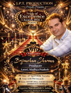 प्रथम 10तक न्यूज चैनल एवं पोर्टल समाचार अंधेरी पश्चिम मुंबई 9303754289 मुंबई, फिल्म प्रोड्यूसर & समाजसेवी बृजमोहन शर्मा को प्रतिष्ठित प्राइड ऑफ़ एक्सीलेंस अवार्ड से सम्मानित किया गया। मुंबई के मेयर हाल में आयोजित भव्य सम्मान समारोह में एसीपी संजय पाटिल , श्रीमती सुंदरी ठाकुर आयोजक तेजेंदर सिंह एस जडेजा (तेजुबा) ने बृजमोहन शर्मा को ट्रॉफी प्रदान की। आयोजक जेबीटी प्रोडक्शन डायरेक्टर तेजेन्द्र सिंह जडेजा तेजुबा ने बताया की प्राइड ऑफ एक्सीलेंस अवार्ड के चौथे सीजन का आयोजन मायानगरी मुंबई में किया गया। आयोजन में एंटरटेनमेंट जगत के साथ साथ सामाजिक और मीडिया के क्षेत्र ने सराहनीय कार्य करने वाली हस्तियों को सम्मानित किया गया। इसी क्रम में मध्य प्रदेश भोपाल लटेरी के जाने माने फिल्म प्रोड्यूसर और समाजसेवी बृजमोहन शर्मा जी को विशेष सम्मान से सम्मानित किया गया। श्री तेजेंदर सिंह एस जडेजा ( तेजुबा) ने बताया श्री शर्मा जी को उनकी फिल्म जगत और उलेखनीय सामाजिक कार्यों के लिए इससे पूर्व भी कई राष्ट्रीय अंतर्राष्ट्रीय पुरस्कार व उपाधियां मिल चुकी है। देश भर में विगत तीन दशको से फिल्म जगत और सामाजिक कार्यों में उल्लेखनीय रूप से सक्रिय रहे है। इस दौरान आपने कई प्रादेशिक व संस्थानों में वरिष्ठ पदों पर कार्य किया और अभी भी कई बड़े संगठनों में वैधानिक पद पर कार्य कर रहे है श्री शर्मा अभी भोपाल में निवासरत है और बहुत ही कम समय में उन्होंने मुंबई में ही नहीं वरन् पूरे देश भर में फिल्मों के क्षेत्र में अपनी एक विशेष पहचान बना चुके है। इस पर सम-सामयिक विषयों पर अपनी उपस्थिति बनाये हुए है। सम्मानित होने पर श्री शर्मा ने कहा कि जब तक लोग और संस्थाएं पत्रकारों को प्रोत्साहित करते रहेगें, पत्रकारिता अपनी प्रासंगिकता सार्थक करते रहेगी। उन्होंने आयोजनकर्ताओं के साथ ज्यूरी का भी धन्यवाद और आभार व्यक्त किया। साथ ही साथ ( तेजुबा) के सुपुत्र पुष्प राज सिंह टी जडेजा जी को उनके जन्मदिन की शुभकामनाएं दी। मनोज वर्मा (स्वतंत्र) प्रधान संपादक प्रथम 10तक न्यूज चैनल एवं पोर्टल राष्ट्रीय अध्यक्ष मीडिया सेल IHRCCO INDIA 8689975743 Post Views: 7 Post navigation *छत्तीसगढ़ के सारंगढ़ जिले में गौमाता ने तीन बच्चों को दिया जन्म प्रदेश अध्यक्ष राजपूत जी ने दिया बधाई*
